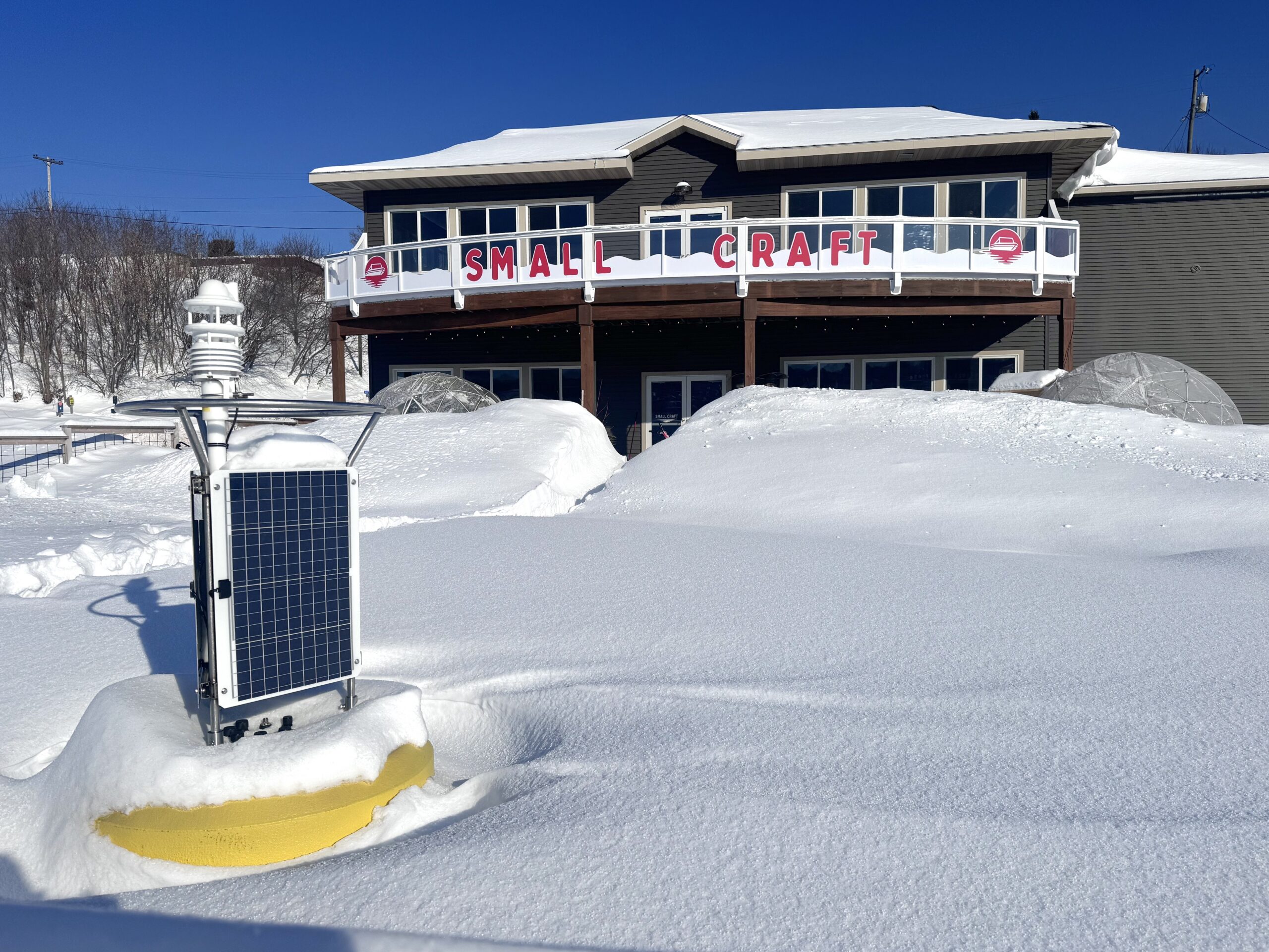 Upper Michigan’s Keweenaw Waterway recently acquired an impressive new waterfront feature in Hancock that sheds light on an important, yet often hidden, aspect of Great Lakes weather and safety. Michigan Tech scientists from the Great Lakes Research Center have installed a full-sized meteorological buoy at Small Craft, a waterfront craft cocktail and event space, to give visitors a firsthand view into how weather and wave data are collected across the Great Lakes. This landfast buoy hull, donated by OTT Hydromet, is affixed with a weather station supported by the Great Lakes Observing System (GLOS) to fill an important gap in water-level weather observations in Hancock and Houghton.